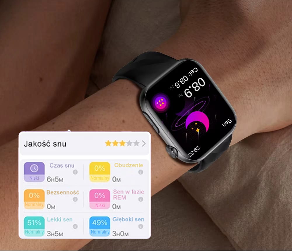 Funkcja monitorowania snu w zegarku EKG-GS200 umożliwia śledzenie przebiegu nocnego odpoczynku oraz ocenę jego jakości. Smartwatch rejestruje całkowity czas snu, fazy snu (lekki, głęboki), momenty wybudzeń oraz ogólny poziom regeneracji organizmu. Wbudowane czujniki analizują nocną aktywność i automatycznie zapisują dane w aplikacji mobilnej, co pozwala obserwować nawyki senne i wprowadzać zmiany poprawiające jakość wypoczynku.