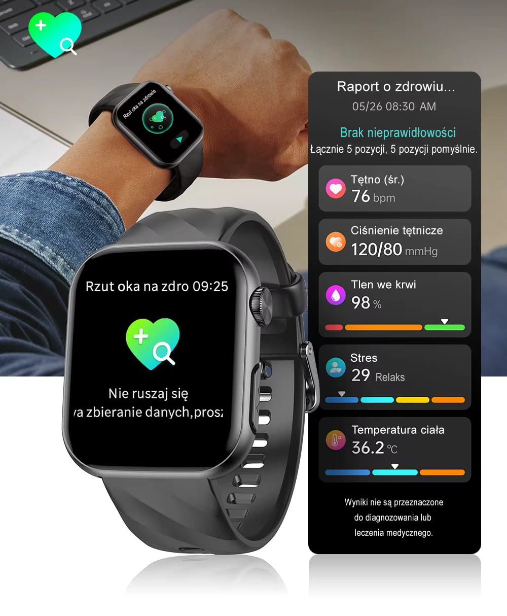 - Pomiary zdrowotne: dystans, kroki, kalorie, tętno, ciśnienie, sen, temperatura, poziom glukozy, EKG, HRV, saturacja, liczba epizodów bezdechu, częstotliwość oddechu, czas niedotlenienia, analiza metabolizmu, monitor parametrów krwi, skład ciała oraz poziom stresu,