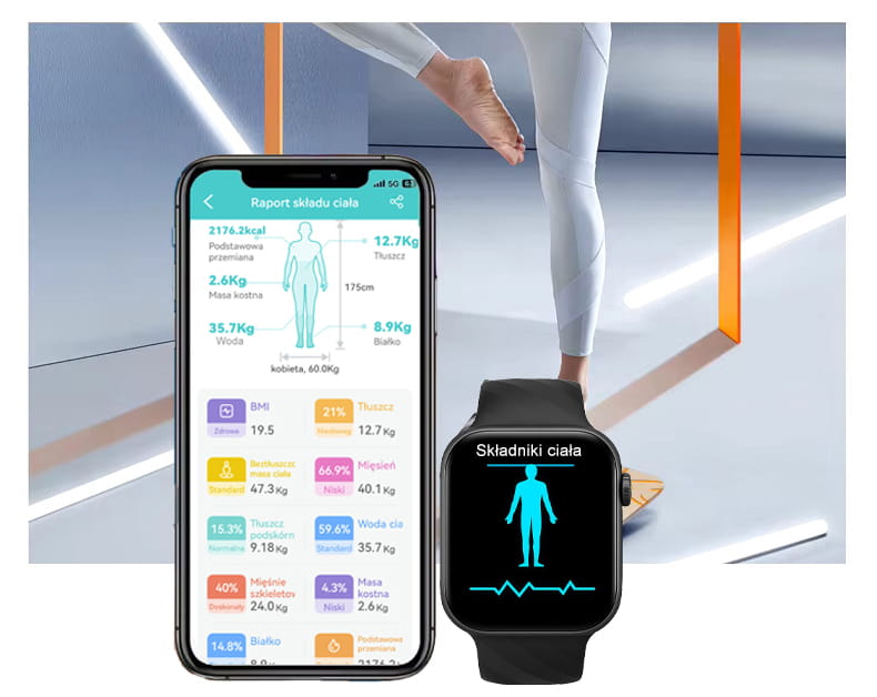 Dodatkowo zegarek z analizą składu ciała dostarcza szczegółowych informacji dotyczących procentowej zawartości tłuszczu, masy mięśniowej, poziomu nawodnienia oraz masy kostnej. Dzięki tym danym użytkownik może lepiej kontrolować swoje wyniki, śledzić zmiany i świadomie dbać o zdrowy styl życia.