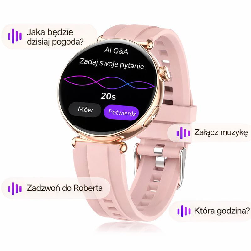 Uzupełnieniem asystenta głosowego jest funkcja AI Pytania i Odpowiedzi, która umożliwia bezpośrednią interakcję ze sztuczną inteligencją na ekranie zegarka. Wystarczy zadać pytanie, a AI w krótkim czasie wygeneruje i wyświetli odpowiedź, dostarczając potrzebnych informacji zawsze wtedy, gdy ich potrzebujesz. Funkcja działa w czasie rzeczywistym przy aktywnym połączeniu zegarka z telefonem, dzięki czemu masz szybki dostęp do wiedzy i praktycznych wskazówek bez sięgania po smartfon.