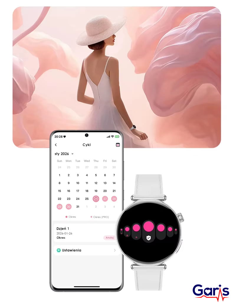 Dzięki zaawansowanej aplikacji połączonej z Kardiowatch EKG-GS70 monitorowanie cyklu menstruacyjnego stało się proste i wygodne. Zegarek umożliwia rejestrowanie daty rozpoczęcia oraz długości miesiączki w trybie podstawowym, a także dostarcza praktycznych wskazówek dotyczących zmian zachodzących w organizmie w poszczególnych fazach cyklu. W rozszerzonym trybie monitorowania, określanym jako okres pro, inteligentne funkcje dodatkowo prognozują termin kolejnej miesiączki oraz szacują dni płodne, wspierając planowanie ciąży w sposób precyzyjny i skuteczny. To nowoczesne rozwiązanie dla kobiet dbających o swoje zdrowie oraz świadomą, kompleksową opiekę nad własnym ciałem.