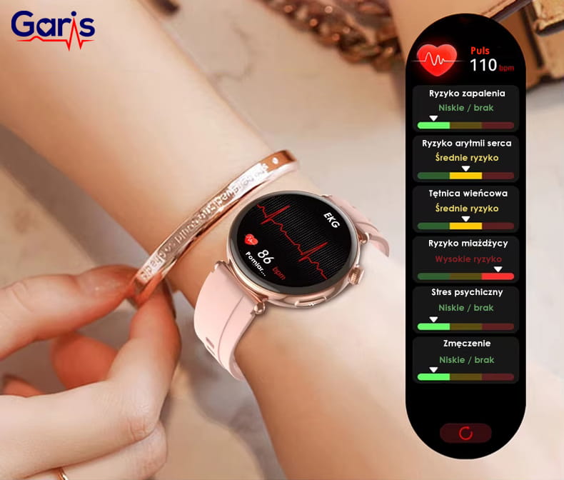 Kardiozegarek GARIS EKG-GS70 został stworzony z myślą o entuzjastach aktywnego stylu życia, którzy chcą połączyć codzienny ruch z nowoczesną technologią. Urządzenie oferuje wiele trybów sportowych, takich jak bieganie, jazda na rowerze, wspinaczka, taniec oraz inne popularne formy treningu. Zegarek rejestruje tętno, liczbę kroków, przebyty dystans oraz spalone kalorie, a wszystkie dane synchronizowane są z intuicyjną aplikacją mobilną. Dzięki temu użytkownik może szczegółowo analizować swoje postępy i utrzymywać wysoki poziom motywacji.